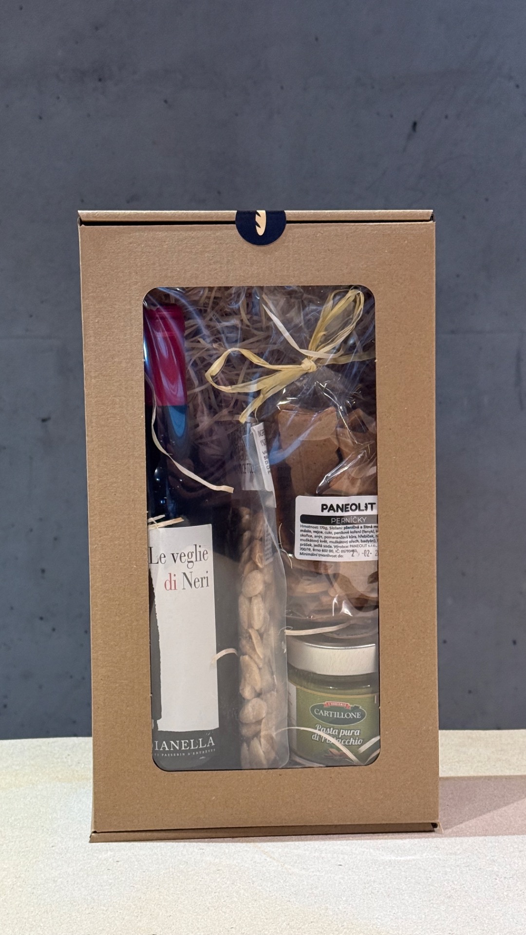 Balíček obsahuje luxusní červené víno z Toskánska v BIO kvalitě, pistáciovou pastu 100% ze Sicílie, sicilské pražené mandle a naše domácí perníčky.